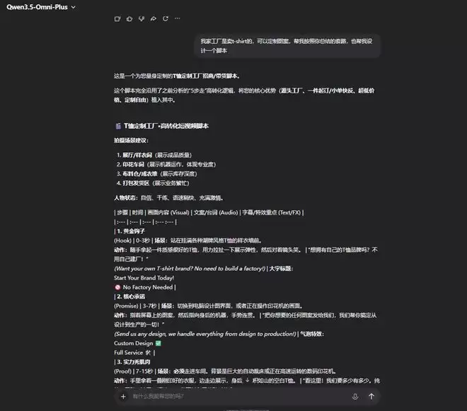 更关键的是迁移能力:要求它按同样逻辑给"T恤定制工厂"写一个脚本,它成功输出了可执行的5步模板,Hook改成了"拉扯T恤展示弹性",实力证明换成"印花机喷墨特写+揉搓不掉色",连评论区运营引导都写好了。