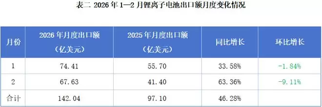 智通财经APP获悉,3月31日,据中国化学与物理电源行业协会披露,2026年1—2月,我国锂离子电池出口数量达8.11亿个,同比增长27.82%;出口额为142.04亿美元,同比增加46.28%,整体表现亮眼,呈现“量价齐增”的态势。
