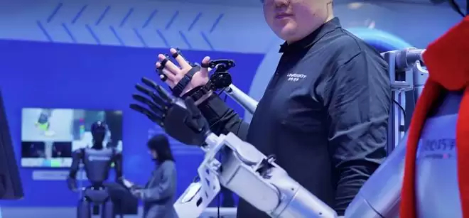 2026中关村论坛年会上,工作人员展示灵巧手通过人类动作提取数据。主办方供图