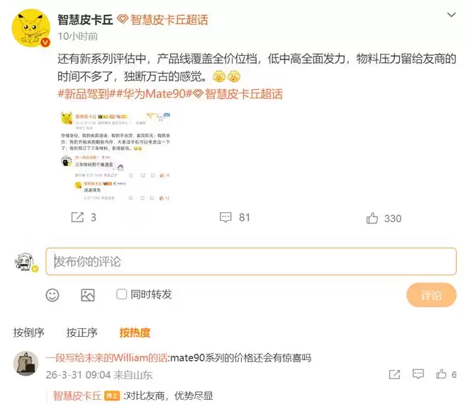 而近期更是有博主透露华为正在评估全新的Mate90系列机型,进一步拓展产品线矩阵,甚至表示华为产品线覆盖全价位档,低中高全面发力,物料压力留给友商的时间不多了。
