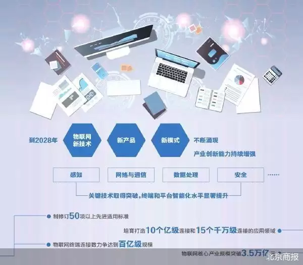 3月31日,工业和信息化部等九部门发布《推动物联网产业创新发展行动方案(2026—2028年)》(以下简称《行动方案》),明确提出发展目标,到2028年,我国物联网终端连接数力争达到百亿级规模,物联网核心产业规模突破3.5万亿元(人民币,下同)。