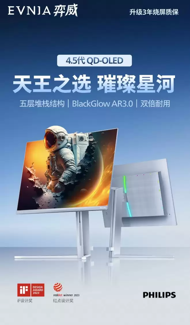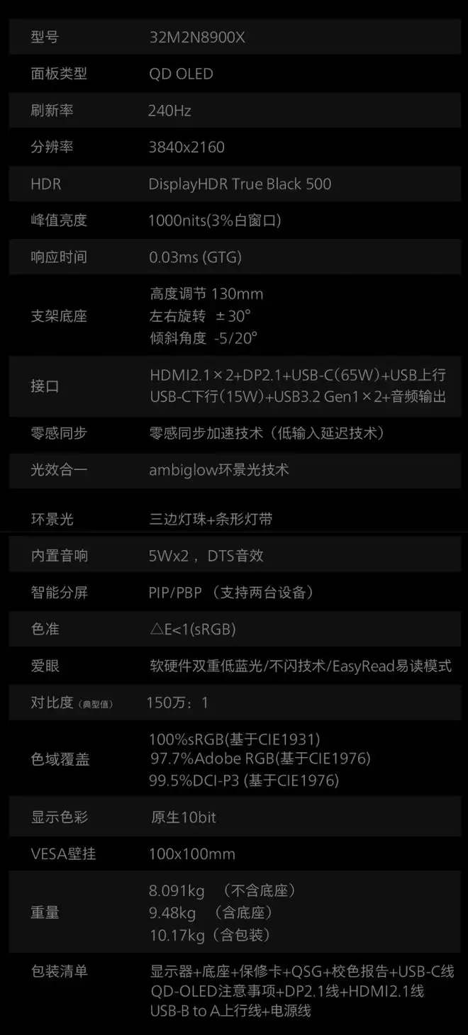 该机配备一块 3840x2160 分辨率 240Hz QD-OLED Penta Tandem 面板,辅以 BlackGlow AR 3.0 零雾度光学层,号称相对上一代环境光反射减低 40%。其 HDR 峰值亮度 1000 尼特,GtG 响应速度 0.03ms,动态对比度 150 万:1,显示器支持原生 10-Bit 色彩,覆盖 99.5% DCI-P3 色域。