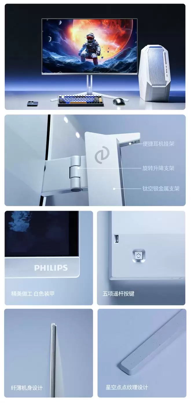 该机使用钛空银色边框 / 支架,其中支架部分集成耳机挂架,同时允许显示器本体实现升降 / 倾斜 / 旋转。显示器带有 RGB 氛围灯,同时集成双 5W 扬声器。