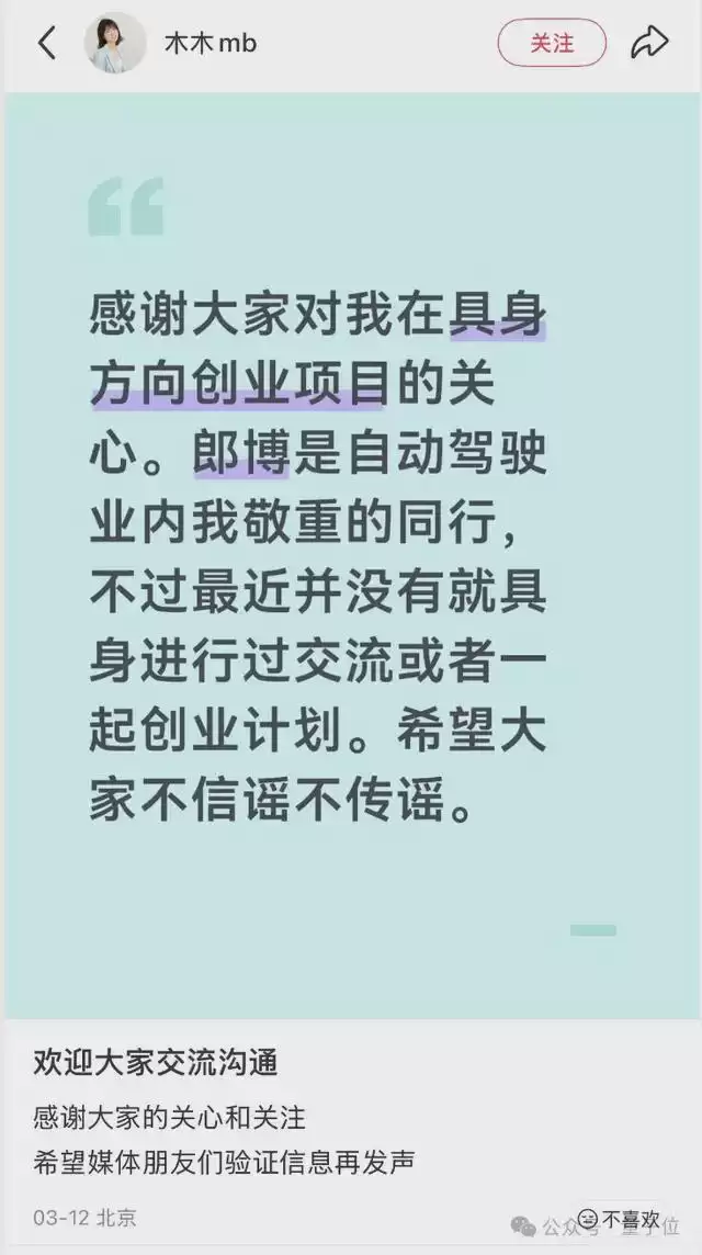 不过一周前穆北鹏自己站出来辟谣,称虽然投身具身智能创业,但并没有与郎咸朋“就具身进行过交流或一起创业计划”。
