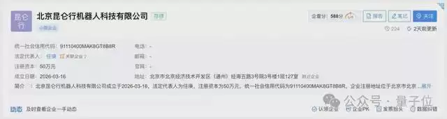 企查查数据显示,北京昆仑行机器人科技有限公司注册于2026年3月16日,经营范围覆盖智能机器人研发、销售,工业机器人制造、销售,同时囊括人工智能应用软件开发、智能控制系统集成等全链条业务(完美贴合具身智能与通用机器人赛道布局)。