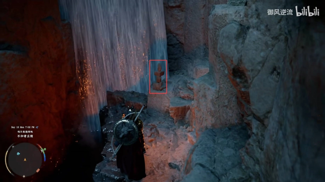 在这个瀑布后面,注意瀑布前有个石堆,瀑布前有石堆就说明里面有东西。