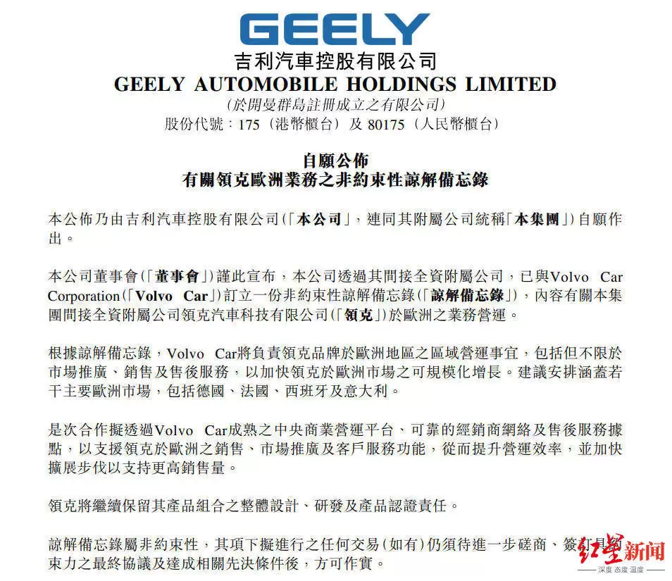 吉利汽车近日宣布,沃尔沃汽车与吉利汽车已正式签署非约束性谅解备忘录,双方将在欧洲市场展开深度合作。根据协议内容,沃尔沃汽车将全面接管领克品牌在欧洲的商业运营及品牌建设工作,旨在借助其成熟的区域市场经验与渠道资源,加速领克品牌在欧洲市场的规模化发展。