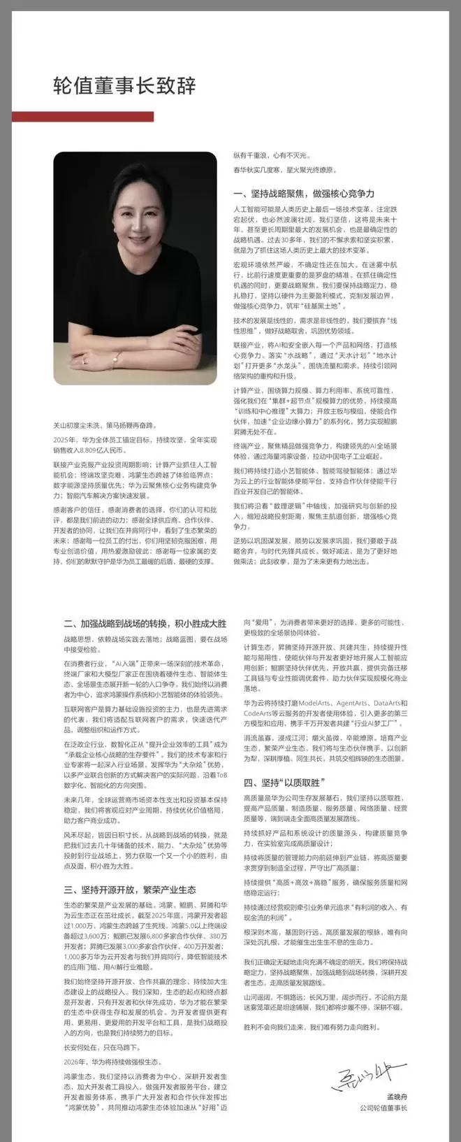 华为2025年的年度报告,以公司轮值董事长孟晚舟简短致辞开篇。文字没有语气,却能传递出冷静和坚定。