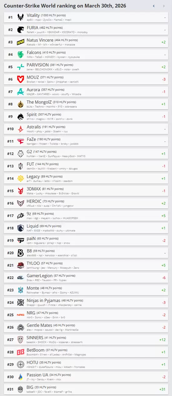 第21至30名区间同样格局大变。从上一区间跌落的GamerLegion暂居第二十二,而TYLOO则从第26名升至第21,领跑该区间。Ninjas in Pyjamas从第21降至第24,NRG与Gentle Mates也有微调。最值得关注的是新面孔——SINNERS闯入前三十,位列第27,将BC.Game挤出了榜单。Passion UA则下滑至第30,勉强守住边线。
