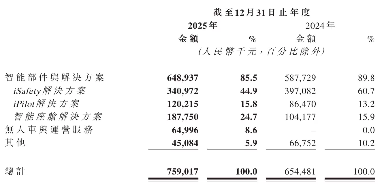 佑驾创新2025年智能部件与解决方案业务收入为6.49亿元,占总收入比重约85.5%。其中,iSafety智能辅助驾驶收入为3.41亿元,较上年同期的4亿元下降25%;iPilot中高阶辅助驾驶收入为1.20亿元,同比增长39.0%;佑驾创新2025年智能座舱解决方案实现营收1.88亿元,较上年同期的1.04亿元增长80.2%,成为拉动公司业务增长的重要引擎。