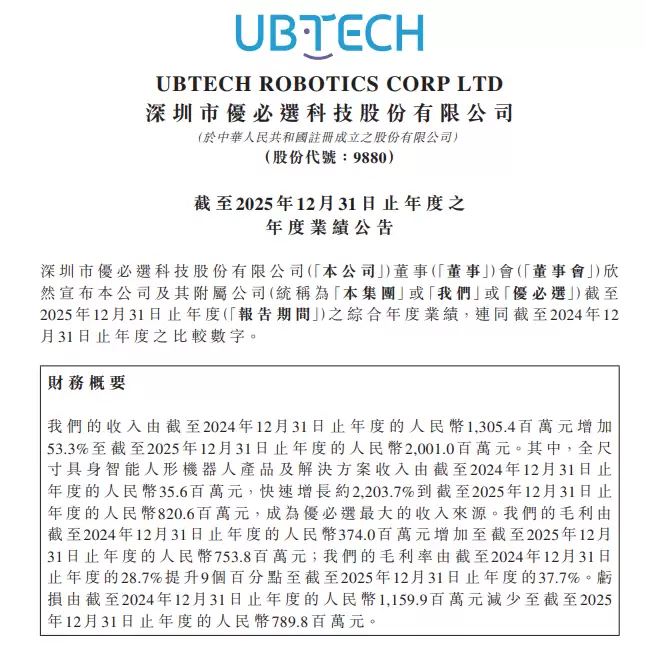 优必选(09880.HK)近日发布年度业绩公告,显示公司在具身智能人形机器人领域实现跨越式发展。截至2025年12月31日的财年内,公司总收入达20.01亿元人民币,同比增长53.3%,其中全尺寸具身智能人形机器人产品及解决方案贡献8.206亿元收入,同比激增2203.7%,一举成为核心业务板块。