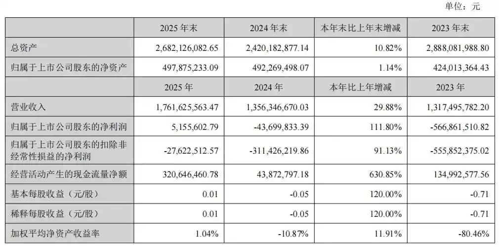 山东墨龙石油机械股份有限公司近日公布的2025年度财务报告显示,公司经营状况实现显著改善,全年归母净利润达515.56万元,成功扭转了2024年亏损4370万元的困境。报告期内,公司营业收入同比增长29.88%至17.62亿元,经营性现金流量净额更是同比激增630.85%,达到3.21亿元,显示出强劲的现金流改善势头。