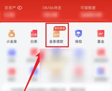 1、在京东金融首页上,点击【金条借款】图标按钮。