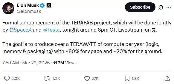 马斯克公布Terafab项目:计划1年内实现1太瓦算力部署
