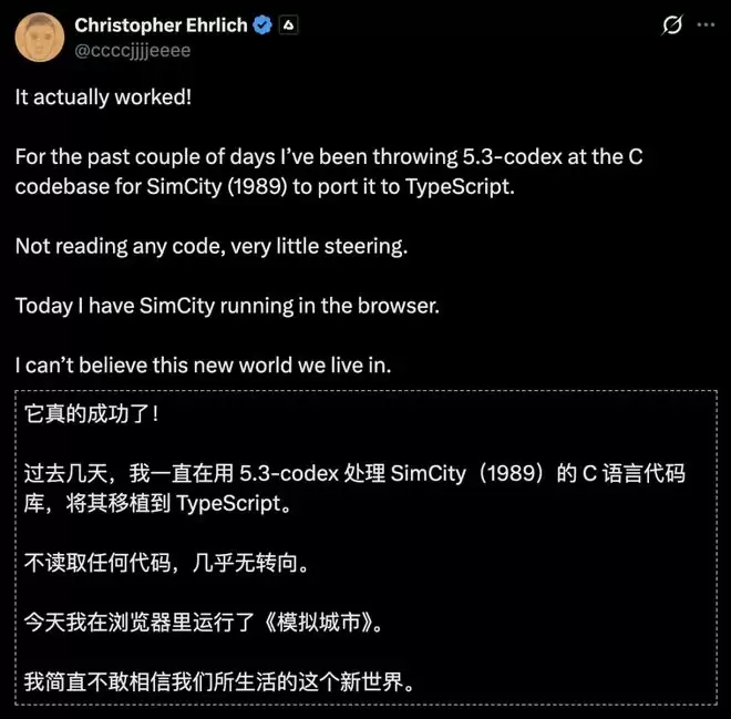 当开发者Christopher Ehrlich把OpenAI的5.3-codex对准1989年的SimCity C代码库,并留下目标转身离开时,他交出了一份关于未来软件工程的新答案:
