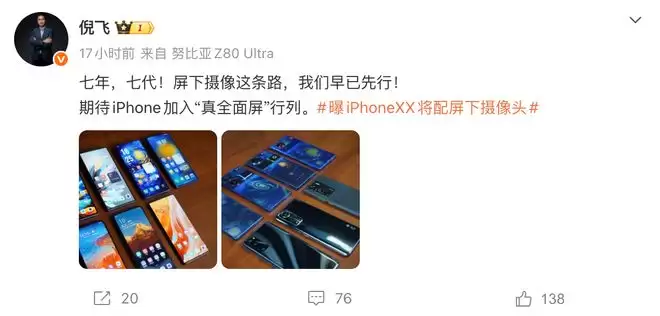 iPhone屏下摄像头进展:努比亚先行,倪飞谈苹果何时加入