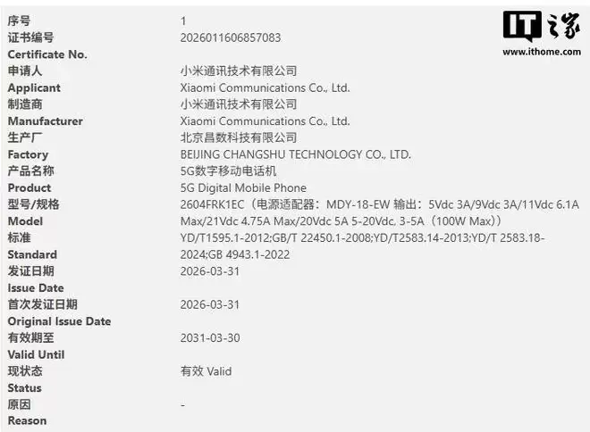 IT之家 4 月 1 日消息,CCC 认证 显示,小米一款 5G 手机于 3 月 31 日入网,型号为 2604FRK1EC,支持 100W 闪充。