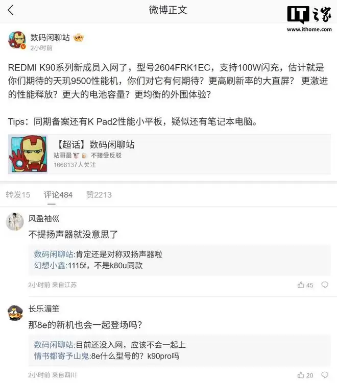 博主 @数码闲聊站 表示,这款新机属于 REDMI K90 系列,“估计就是你们期待的天玑 9500 性能机”。