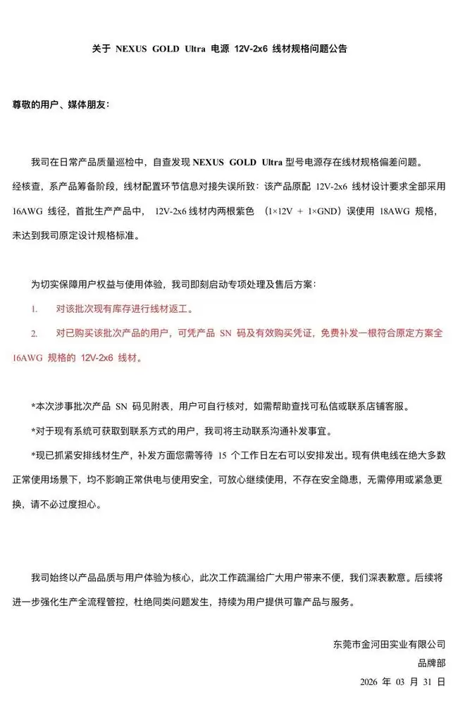 该公司就本次问题致歉,将对该批次现有库存线材返工;对已购买该批次产品的用户,将免费补发一根符合原定方案的全 16AWG 规格的 12V-2×6 线材。