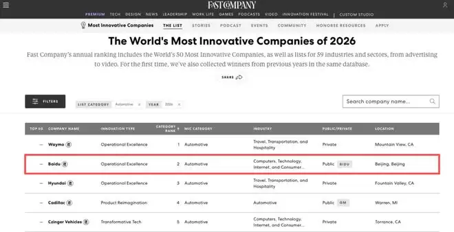 萝卜快跑登顶Fast Company 2026汽车榜,位列全球第二