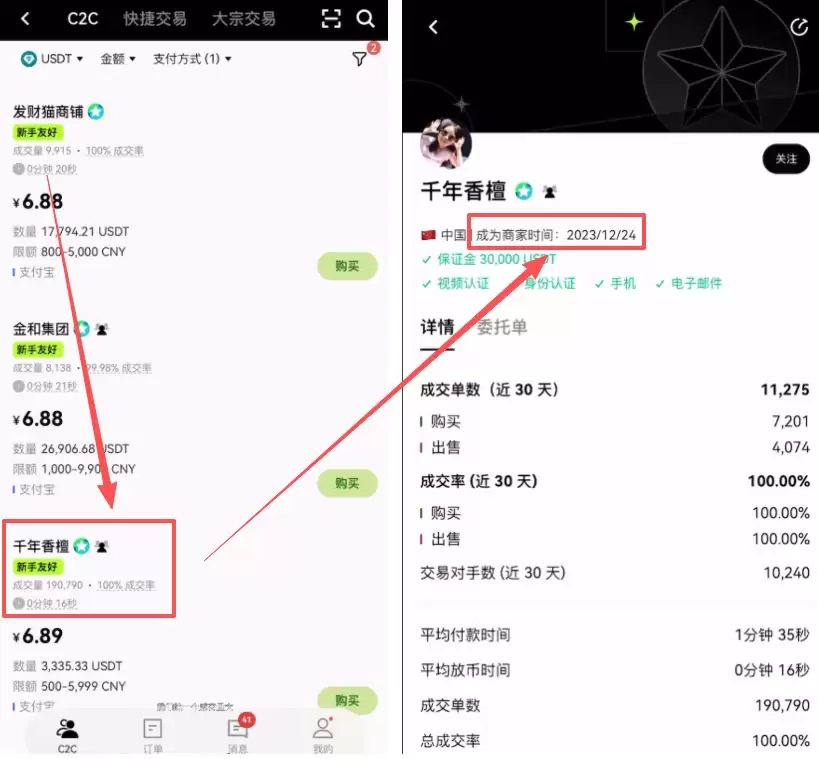 注册时间:最好在半年以上。成交数据:选择成交量大、成单率高的商家。逻辑很简单:存活时间越久的商家,资金越安全,交易风险越低。