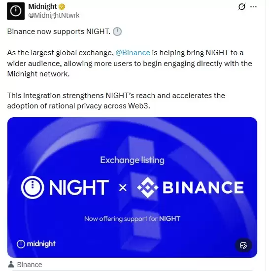 与此同时,Midnight Network官方确认币安现已全面支持NIGHT交易,使得该代币的覆盖范围扩展至全球交易用户。