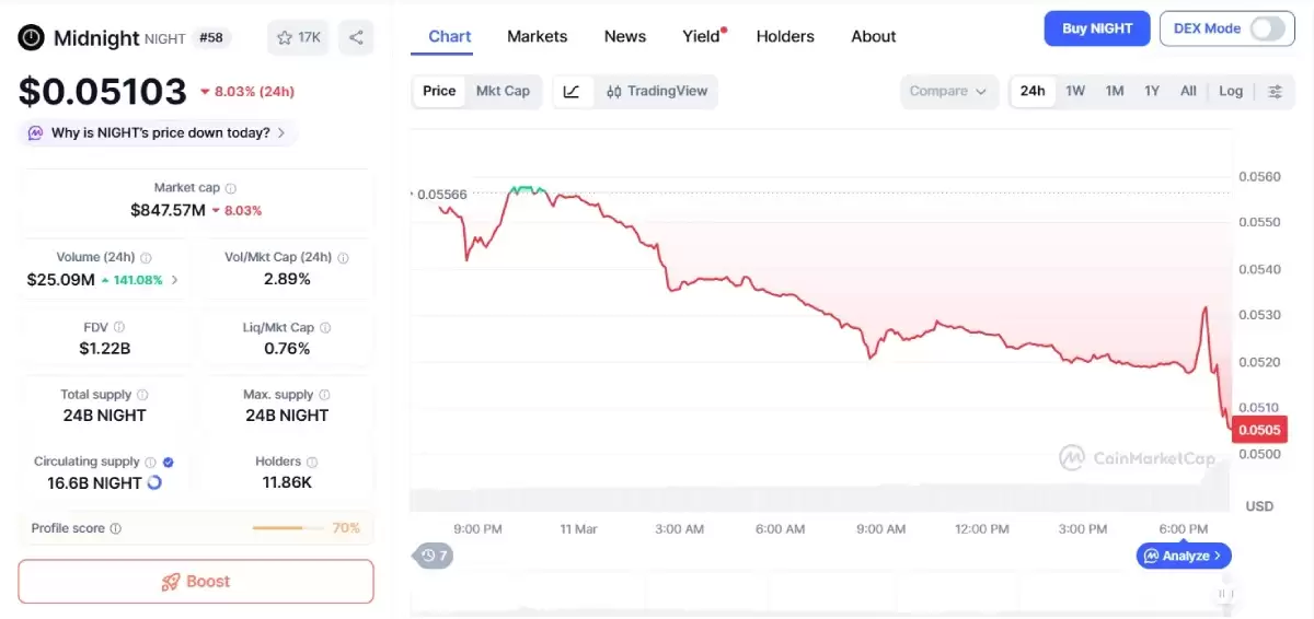 根据CoinMarketCap最新数据,NIGHT当前交易价格约为0.05103美元,过去24小时下跌8.03%。虽然价格从0.05566美元峰值回落,但交易量却逆势飙升141.08%,达到2509万美元。