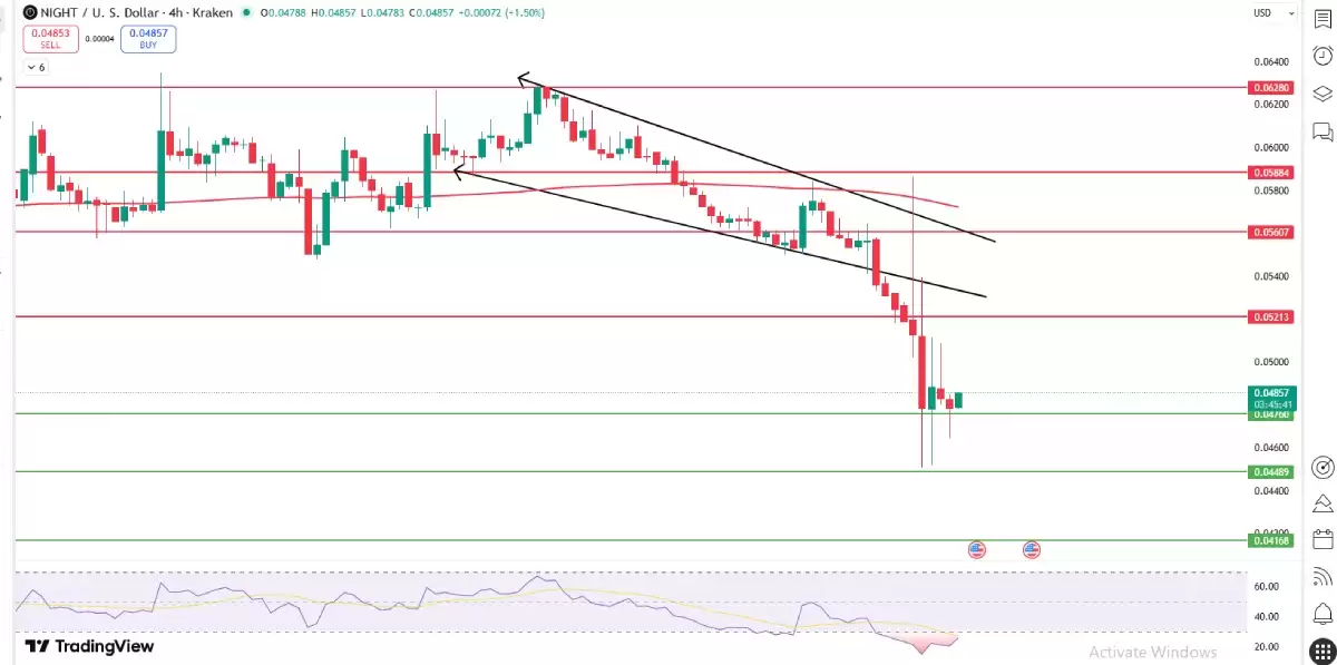 当NIGHT代币在4小时图表上跌破下降楔形结构后,价格预测前景短期转弱。