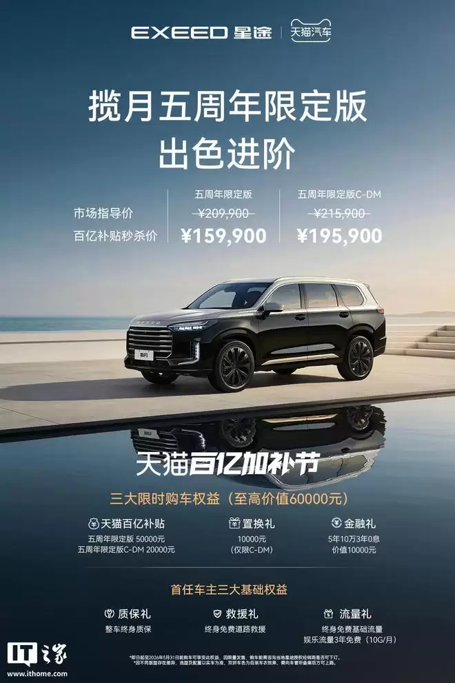 IT之家 4 月 1 日消息,奇瑞星途揽月五周年限定版已上市,共推出 2 款车型,最新指导价分别为 20.99 万元和 21.99 万元,限时补贴秒杀价 15.99 万元和 19.59 万元,新车以银黑双拼车漆外观升级为核心亮点。