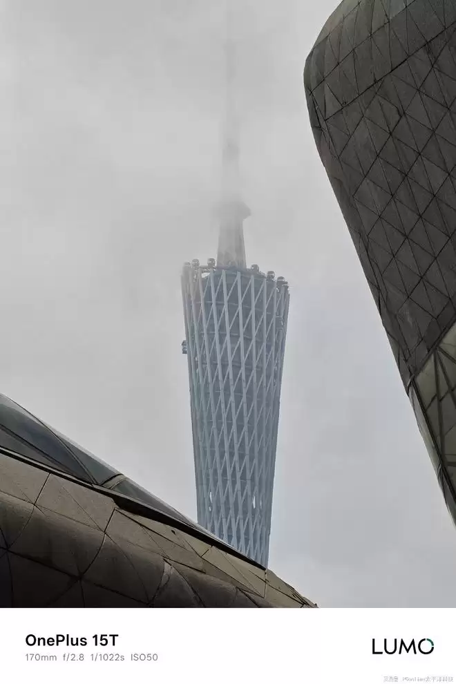 而在氛围感拉满的建筑大片,离不开适合的滤镜加持。在广州阴雨连连的天气情况下,想要更好地展现建筑氛围感,一加 15T影像系统内置的「黑白」滤镜是一个不错的选择。我们看到这张放大到170mm焦段拍摄的广州塔,线条细节依旧清晰锐利,没有太强的涂抹感,而「黑白」滤镜下的样张还能保留足够的暗部细节,暗光区域的建筑线条依旧清晰可见,没有呈现出一片死黑。