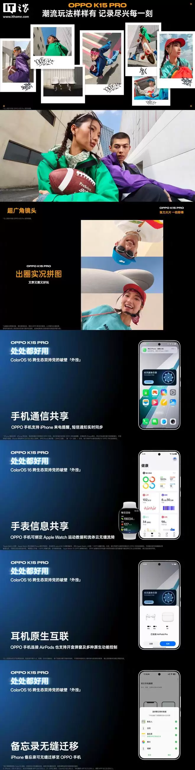 OPPO K15 Pro 拥有 5000 万像素光学防抖主摄,升级超广角镜头,支持出圈实况拼图等影像潮流玩法。新机还搭载全新 ColorOS 16 系统,支持手机通信共享、手表信息共享、耳机原生互联、备忘录无缝迁移,适合跨生态双持党与换机玩家。
