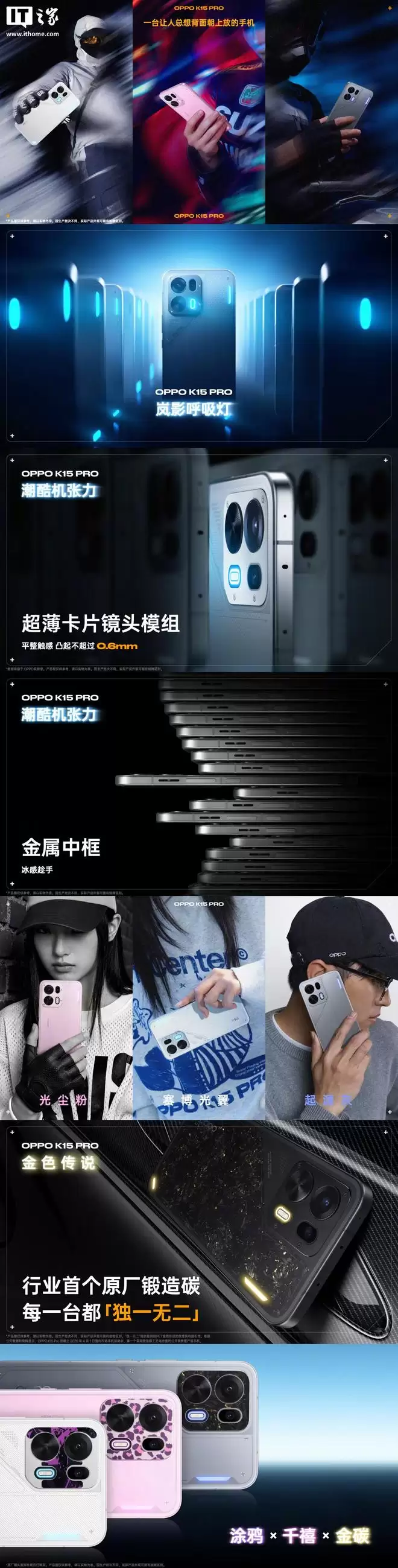 据介绍,全新 OPPO K15 Pro 带来赛博机能风配色,「赛博光翼」「光尘粉」和「起源灰」,更有行业首个原厂锻造碳配色「金色传说」。