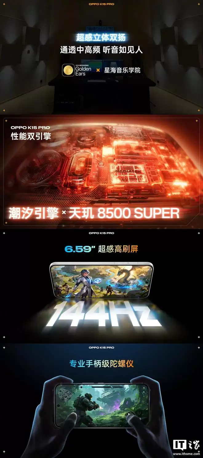OPPO K15 Pro 拥有全新超感立体双扬,由 OPPO 金耳朵实验室与星海音乐学院联合调音,宣称“音质通透,沉浸感拉满”。