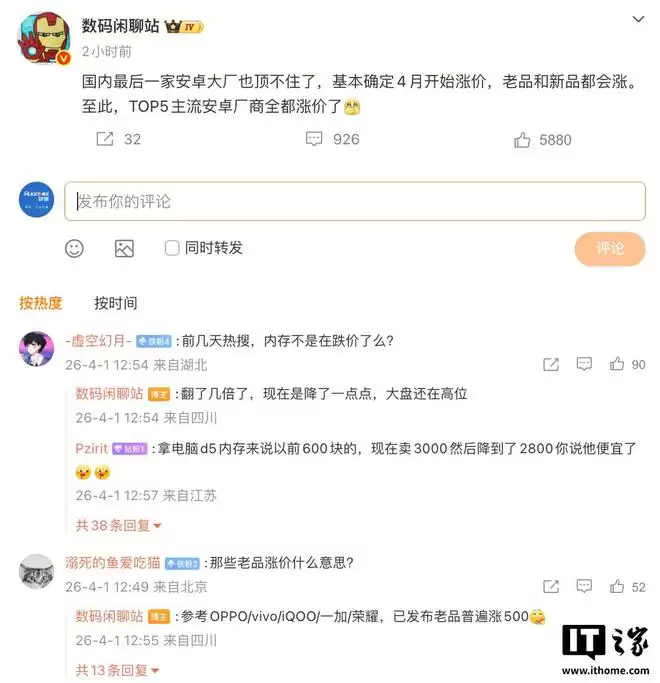 IT之家 4 月 1 日消息,博主 @数码闲聊站 发文,称国内最后一家安卓大厂也顶不住了,基本确定 4 月开始涨价,老品和新品都会涨。至此,TOP5 主流安卓厂商全都涨价。