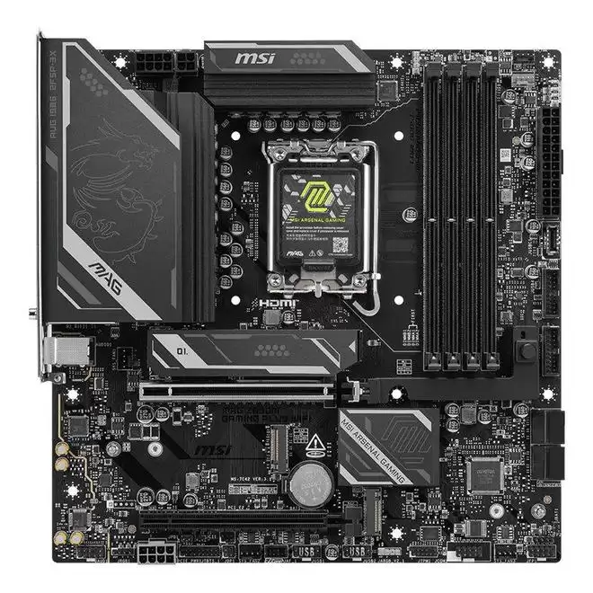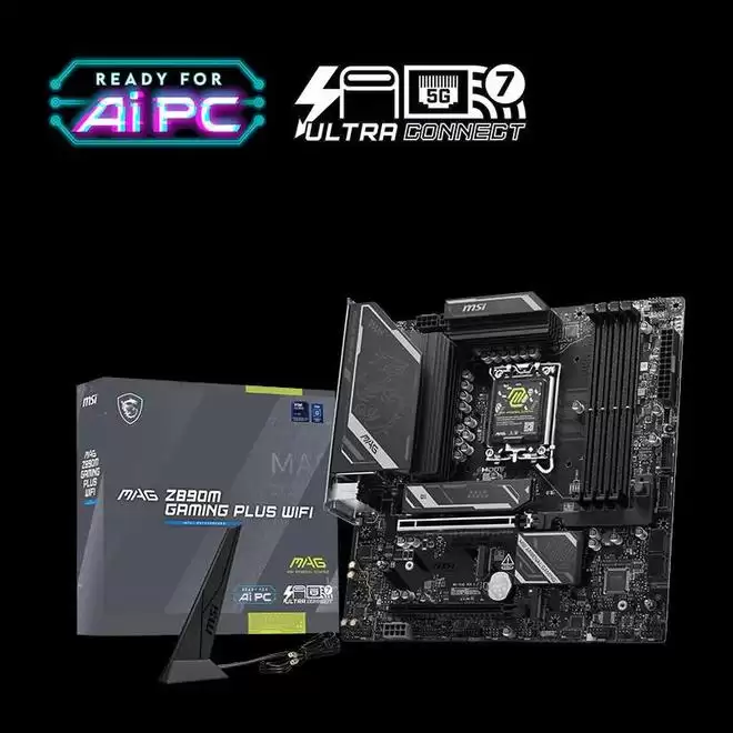 MAG Z890M GAMING PLUS WIFI 采用标准 Micro-ATX 板型,基于 6 层 PCB,搭载 12+1+1+1 相供电,支持 8800+ MT/s 内存超频,提供 1 个后置雷电 4,具备显卡快拆、M.2 快装、Wi-Fi 天线快装设计。