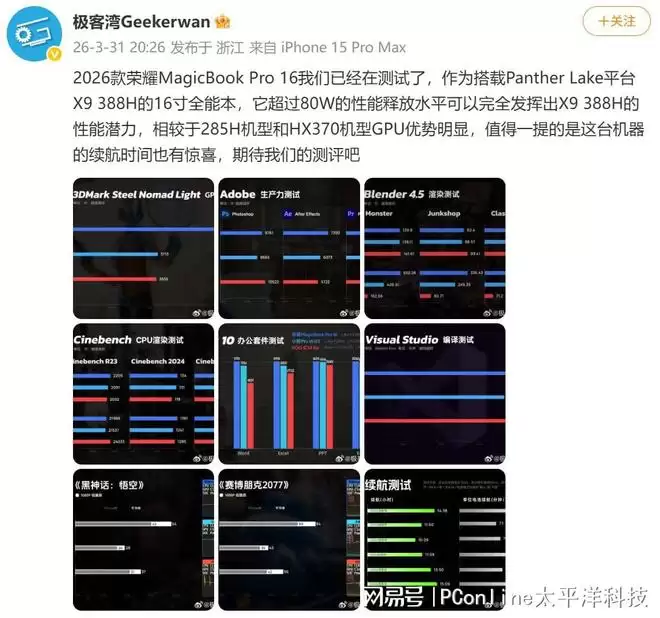 而在性能方面,根据极客湾的实测,荣耀MagicBook Pro 16 2026可以完全发挥X9 388H处理器的性能潜力,相较于285H机型和HX370机型GPU优势明显。