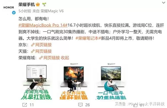 3月31日,荣耀最新释放了2026款荣耀MagicBook Pro 系列的续航和性能预热海报。最新数据显示,荣耀MagicBook Pro 14 2026真实续航时长达16.7小时,荣耀MagicBook Pro 16 2026性能释放至高达到88W,均表现出了领先行业同档产品水平。而同时,多家科技媒体的实测表现也印证了新品的强大产品力。