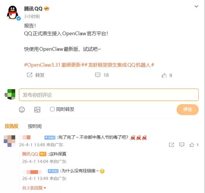 4月1日消息,腾讯QQ官微今日宣布,QQ 正式原生接入 OpenClaw 最新平台。