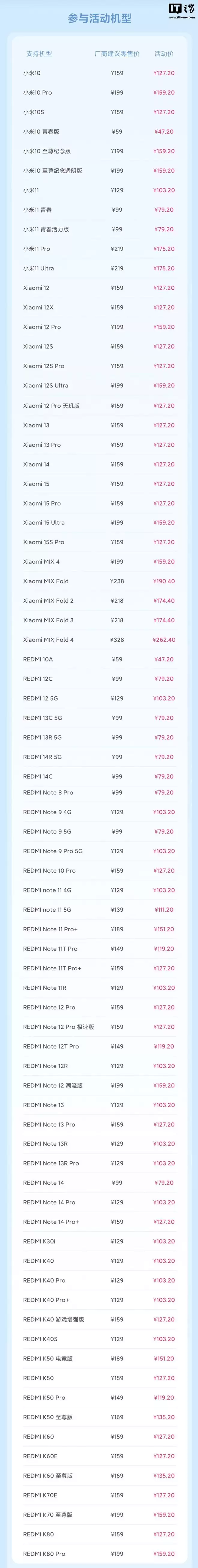 小米 10:活动价 127.20 元小米 10 Pro:活动价 159.20 元小米 10S:活动价 127.20 元小米 10 青春版:活动价 47.20 元小米 10 至尊纪念版:活动价 159.20 元小米 10 至尊纪念透明版:活动价 159.20 元小米 11:活动价 103.20 元小米 11 青春:活动价 79.20 元小米 11 青春活力版:活动价 79.20 元小米 11 Pro:活动价 175.20 元小米 11 Ultra:活动价 175.20 元Xiaomi 12:活动价 127.20 元Xiaomi 12X:活动价 127.20 元Xiaomi 12 Pro:活动价 159.20 元Xiaomi 12S:活动价 127.20 元Xiaomi 12S Pro:活动价 127.20 元Xiaomi 12S Ultra:活动价 159.20 元Xiaomi 12 Pro 天玑版:活动价 127.20 元Xiaomi 13:活动价 127.20 元Xiaomi 13 Pro:活动价 127.20 元Xiaomi 14:活动价 127.20 元Xiaomi 15:活动价 127.20 元Xiaomi 15 Pro:活动价 127.20 元Xiaomi 15 Ultra:活动价 159.20 元Xiaomi 15S Pro:活动价 127.20 元Xiaomi MIX 4:活动价 159.20 元Xiaomi MIX Fold:活动价 190.40 元Xiaomi MIX Fold 2:活动价 174.40 元Xiaomi MIX Fold 3:活动价 174.40 元Xiaomi MIX Fold 4:活动价 262.40 元REDMI 10A:活动价 47.20 元REDMI 12C:活动价 79.20 元REDMI 12 5G:活动价 103.20 元REDMI 13C 5G:活动价 79.20 元REDMI 13R 5G:活动价 79.20 元REDMI 14R 5G:活动价 79.20 元REDMI 14C:活动价 79.20 元REDMI Note 8 Pro:活动价 79.20 元REDMI Note 9 4G:活动价 103.20 元REDMI Note 9 5G:活动价 79.20 元REDMI Note 9 Pro 5G:活动价 103.20 元REDMI Note 10 Pro:活动价 127.20 元REDMI Note 11 4G:活动价 103.20 元REDMI Note 11 5G:活动价 111.20 元REDMI Note 11 Pro+:活动价 151.20 元REDMI Note 11T Pro:活动价 119.20 元REDMI Note 11T Pro+:活动价 127.20 元REDMI Note 11R:活动价 103.20 元REDMI Note 12 Pro:活动价 127.20 元REDMI Note 12 Pro 极速版:活动价 127.20 元REDMI Note 12T Pro:活动价 119.20 元REDMI Note 12R:活动价 103.20 元REDMI Note 12 潮流版:活动价 159.20 元REDMI Note 13:活动价 103.20 元REDMI Note 13 Pro:活动价 127.20 元REDMI Note 13R:活动价 103.20 元REDMI Note 13R Pro:活动价 103.20 元REDMI Note 14:活动价 79.20 元REDMI Note 14 Pro:活动价 103.20 元REDMI Note 14 Pro+:活动价 127.20 元REDMI K30i:活动价 103.20 元REDMI K40:活动价 103.20 元REDMI K40 Pro:活动价 103.20 元REDMI K40 Pro+:活动价 103.20 元REDMI K40 游戏增强版:活动价 127.20 元REDMI K40S:活动价 103.20 元REDMI K50 电竞版:活动价 151.20 元REDMI K50:活动价 127.20 元REDMI K50 Pro:活动价 119.20 元REDMI K50 至尊版:活动价 135.20 元REDMI K60:活动价 127.20 元REDMI K60E:活动价 127.20 元REDMI K60 至尊版:活动价 135.20 元REDMI K70E:活动价 127.20 元REDMI K70 至尊版:活动价 159.20 元REDMI K80:活动价 127.20 元REDMI K80 Pro:活动价 159.20 元