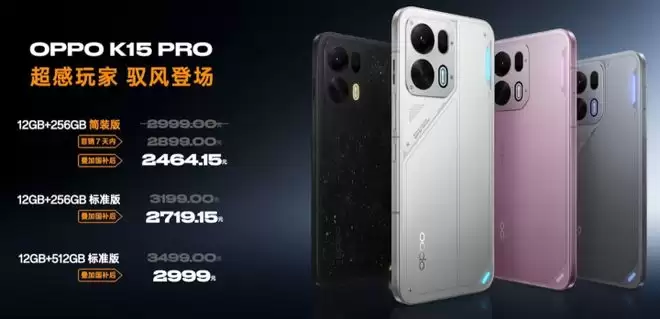 OPPO K15Pro提供了12GB+256GB与12GB+512GB两个存储版本,售价分别为3199元与3499元。12GB+256GB还提供了无充电器的精简版,该版本在首销7天内优惠100元,首销价仅2899元。