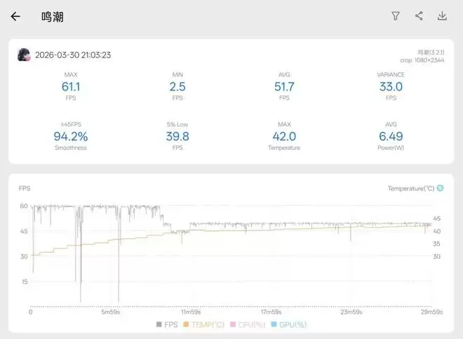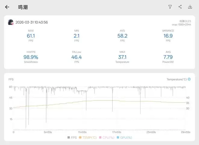 即便如此,OPPO K15 Pro+依然很难征服《鸣潮》,在星炬学院里开摩托还是稳定掉帧,只是现在离开星炬学院后,机身温度很快就能恢复正常,平均帧数58.2帧,基本可以流畅游玩了。