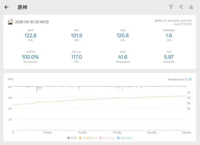 你别说,这次帧数也挺稳定的。半小时跑下来,平均帧数达到了120.81帧,5%Low帧也有117帧,就是整机温度更高了,接近39.5°C的水平,甚至比没有风扇的同定位产品还高一些。