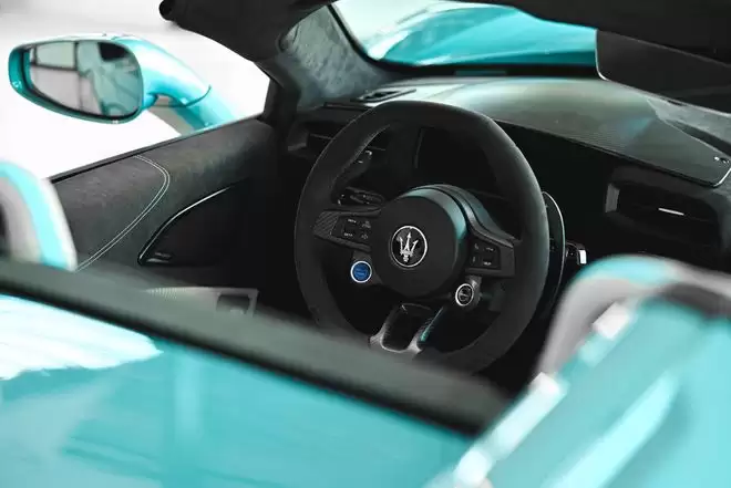 本次揭幕盛典的焦点,当属首度登陆中国市场的玛莎拉蒂最新超跑MCPURA,该车型在延续MC20经典基因的同时,融合GT2 Stradale的设计风格,实现全面进阶。这款座驾集三叉戟品牌的卓越性能、优雅气质与运动基因于一身,诠释意式型格的终极姿态。车辆搭载品牌100%自主研发的“Nettuno海神”3.0升V6双涡轮增压发动机,可爆发出630匹马力。其核心技术源自F1顶级赛事的预燃室燃烧系统,搭配碳纤维单体壳车身,将功率重量比推至2.33 kg/CV的卓越水准。当标志性蝴蝶门徐徐开启,轻量化设计与空气动力学的精妙融合便尽数展露,锋芒毕现。现场展出的MCPURA Cielo,身披AI幻彩蓝(AI Aqua Rainbow)专属涂装,这一奇妙色彩由玛莎拉蒂Fuoriserie私享定制项目倾力打造,日光之下,车身可呈现虹彩般的灵动变幻,光影流转间,尽现个性型格。