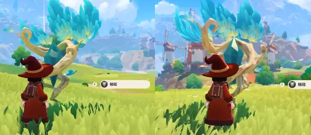 大家可以先熟悉一下魔力之源被唤醒之后的状态。这对于玩家而言,在探索地图时就可以迅速的区分已经激活,还有没有激活的模拟资源,可以避免做无用功。我们需要重点找到那些还没有被激活的魔力之源,这一类模拟资源就是我们需要交互操作的目标。当我们来到未被唤醒的魔力之源之前,可以先进行基础性的交互操作。此时游戏界面就会有一个明确的提示,只需要扔出一只任意的精灵,就可以唤醒。