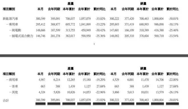 4月1日,比亚迪股份(01211.HK)港交所公告,3月新能源汽车销量30.02万辆,去年同期37.74万辆。新能源汽车本年累计销量70.05万辆,同比下降30.01%。