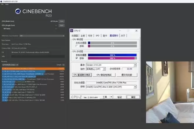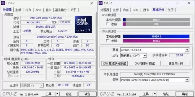在默认设置下,在CPU-Z(V2.19)版本中,酷睿Ultra 7 270K Plus取得了单核906、多核18925分的成绩,已经略微超过了Ultra 9 285K。