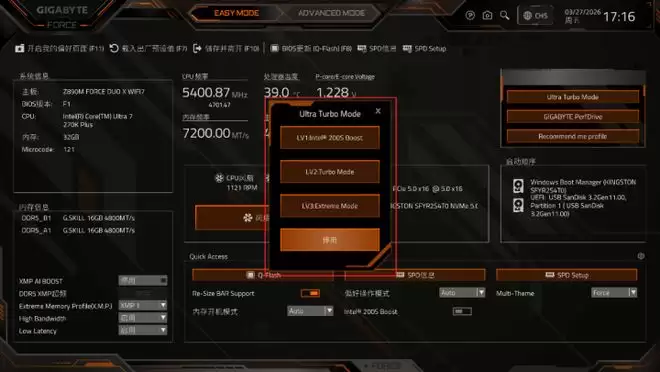 由于Ultra 7 270K Plus处理器也是不锁频的,因此也极有超频潜力。并且在Ultra 200S主板上,除了默认的LV1:200s Boost功能,技嘉在此基础上还特别设计了LV2 Ultra Turbo Mode和LV3:Extreme Mode模式,为Z890主板带来零成本的性能飞跃。