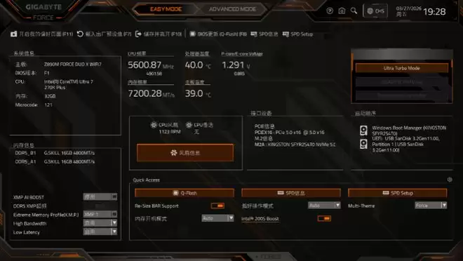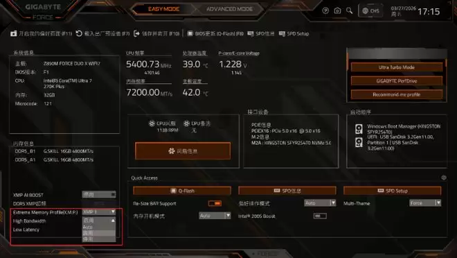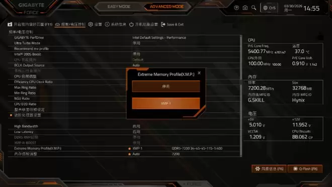在玩家们用的比较多的超频设置方面,技嘉带来了多重优化。首先以内存性能为例,此次我们搭配的G.SKILL TREDEZON DDR5 16GB*2内存支持7200 MT/s的XMP配置(关闭XMP状态下为4800 MT/s)。