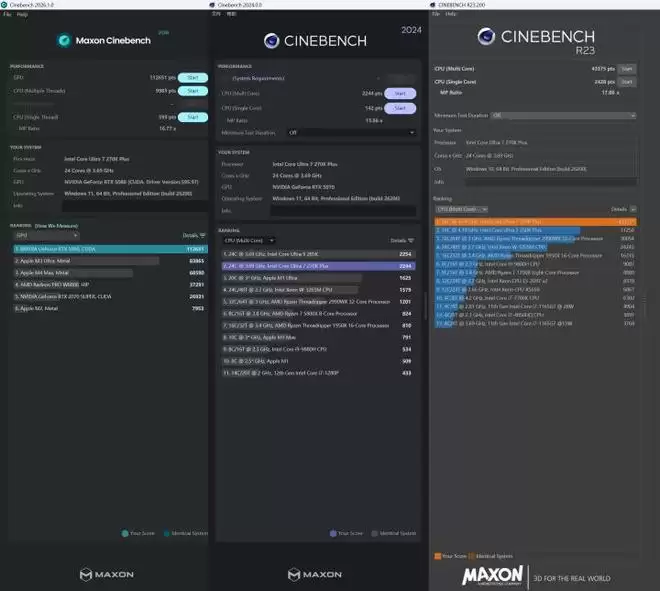 在CINEBENCH系列基准测试的CPU测试中,酷睿Ultra 7 270K Plus在CINEBENCH 2024/2026版本中,多核成绩分别高达2244 pts和112651pts ,常用的R23版本中CPU单核成绩为2428 pts,多核成绩高达43375 pts,均处于目前消费者处理器的领先水准,在技嘉Z890M战鹰DUO X主板上发挥出色。