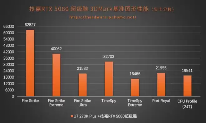在3DMARK的基准图形性能测试中,技嘉RTX 5080超级雕TimeSpy的成绩高达32703分(显卡分数,下同),TimeSpy Extreme达到16466分。24线程的CPU Profile测试中,得分到19541,这个成绩同样已经超过了Ultra 9 285K。
